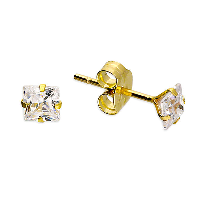 Elegant gold stud earrings with a sparkling square-cut stone. Stone Type: Cubic Zirconia Height: 3.00mm...